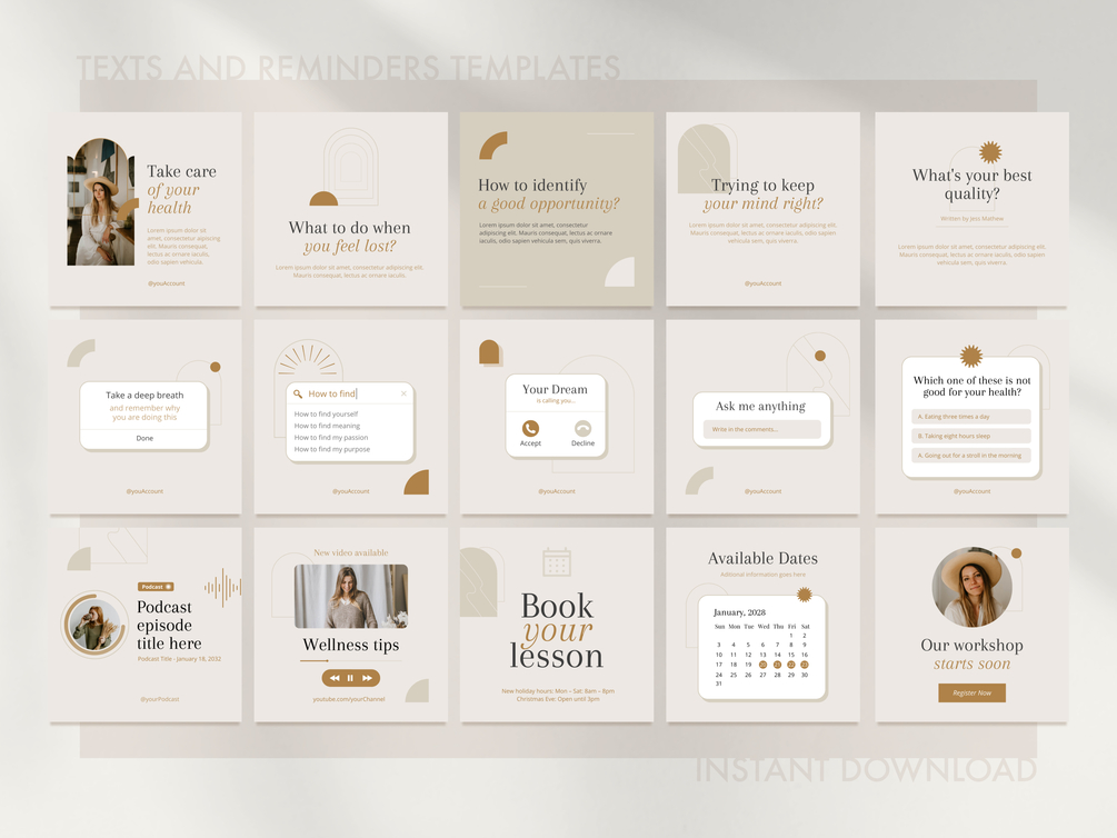 ✨ Beautiful Instagram post template creator. Use this awesome Instagram theme to increase your small business, reach your costumers and be a recognize entrepreneur. This Instagram Post pack is great for coaches, women, content creator and anyone who are looking for a beauty and minimalist Insta feed. This Canva Template is very easy to edit. You can do it by yourself through CANVA desktop or mobile app. These 92 fully customizable preset Instagram Post templates will save your time and help you build community trust, share wellness and health quotes, tips and more.